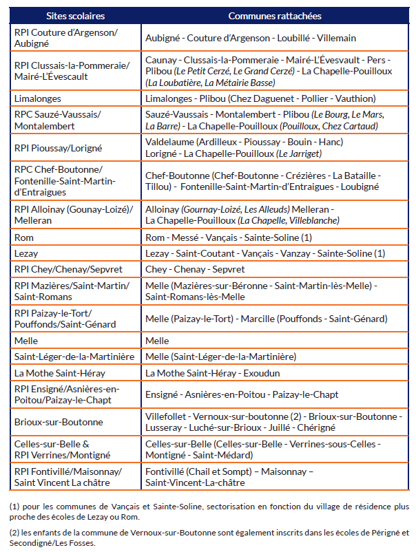- Vous devez vous rapprocher de la communauté de communes uniquement si la demande de dérogation rentre dans les champs réglementaires (ci-dessus) vers une école hors compétence communautaire. Mellois en Poitou doit donner son accord ou non pour l’inscription dans une école située dans une commune extérieure.